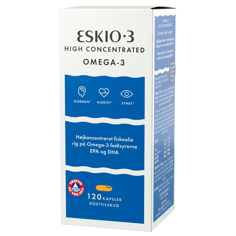 Eskio-3 er ude med et kosttilskud der består af højkoncentreret fiskeolie rigt på omega-3-fedtsyrerne EPA og DHA. Kommer her i en pakke med 120 kapsler.