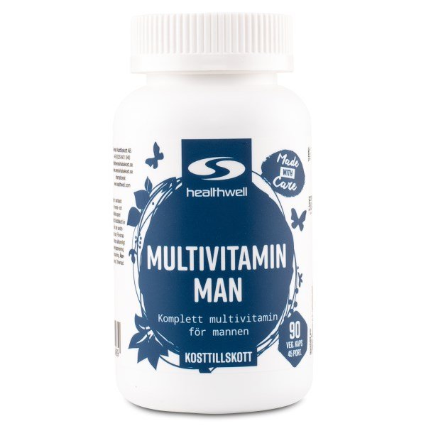 Multivitamin Man er et komplet multivitamin- og multimineraltilskud, som er specielt tilpasset til mandens behov, med et urte-, grøntsags- og frugtkompleks. To kapsler om dagen af dette multivitamin giver dig den anbefalede daglige indtagelse af de vigtigste vitaminer og mineraler, til en sundere livsstil. Healthwell Multivitamin Man indeholder blandt andet D3-vitamin, som vi oftest får via solens stråler, og som er en vigtig byggesten for cellevækst og nervesystemts normale funktion. Kapslerne er helt vegetabilske og passer til de allerfleste, uanset madvanerne.