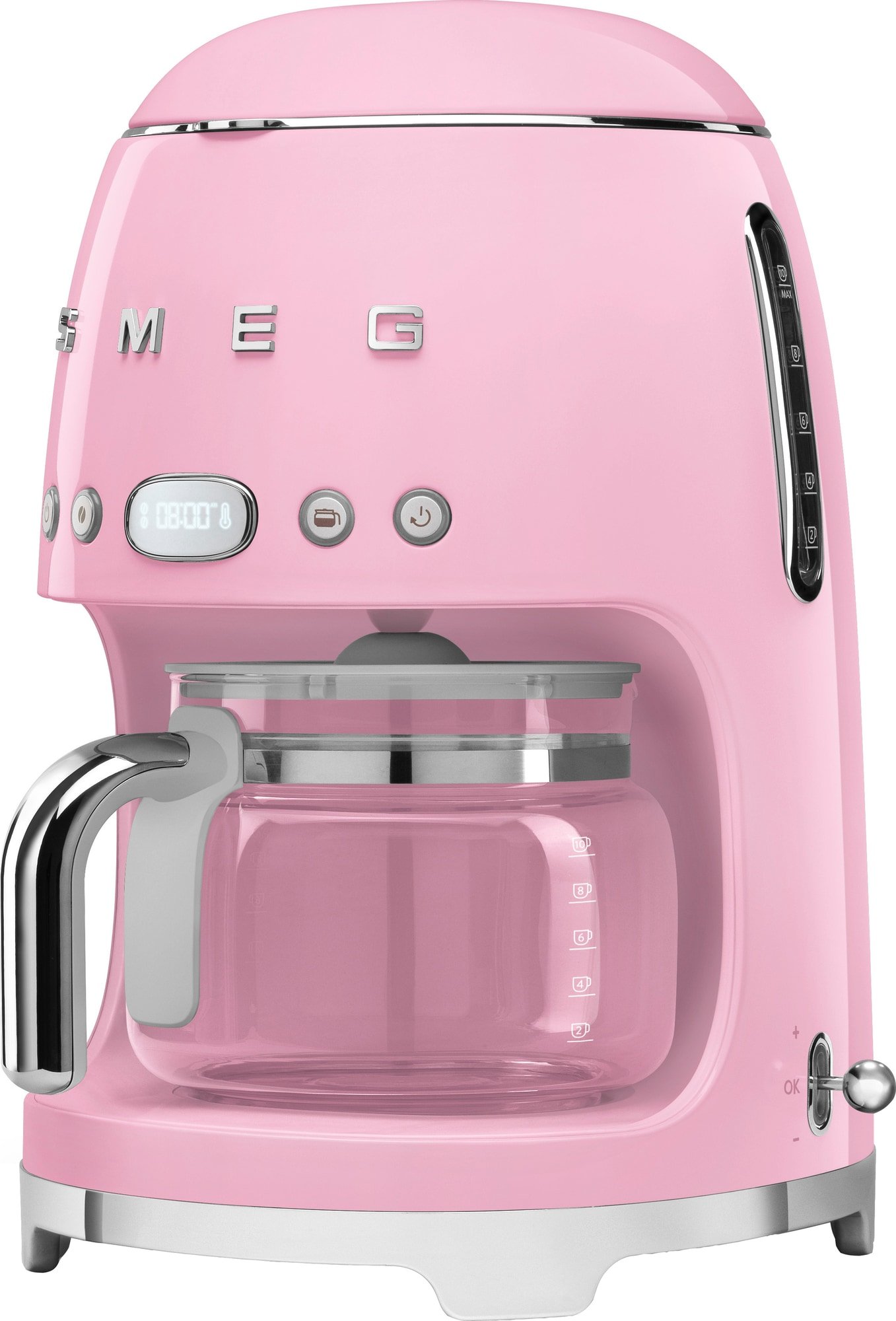 Nyd en lækker kop kaffe med denne Smeg 50s Style kaffemaskine DCF02PKEU. Den har en 1,4 l kapacitet og praktiske funktioner som drypstop, hold varm-funktion og automatisk slukning.